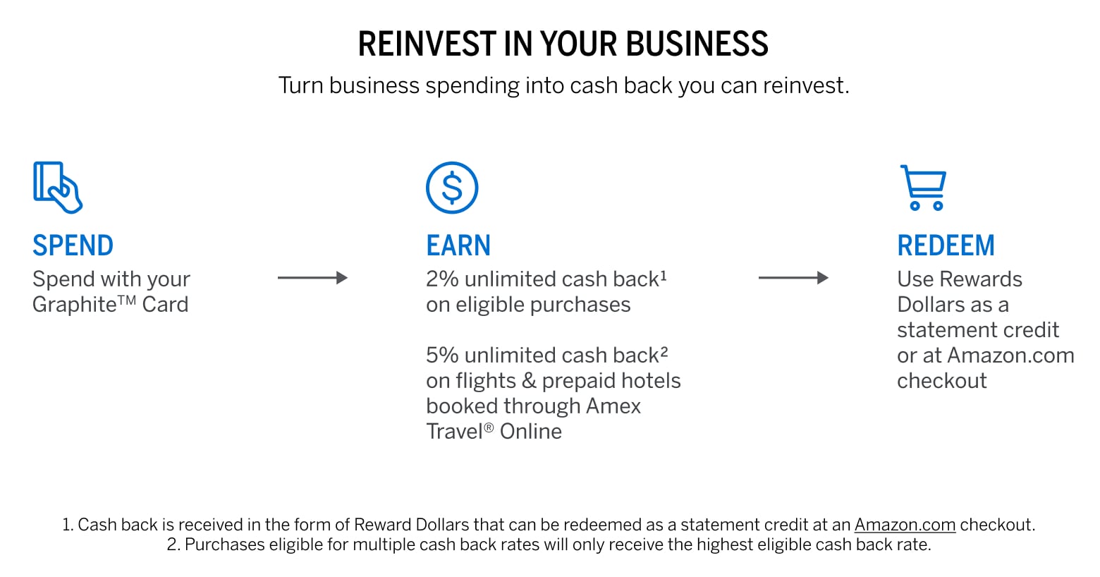 Basic Card Members will earn Reward Dollars (Reward dollars) for eligible purchases on their Graphite™ Business Cash Unlimited Card (Card Account). The number of Reward dollars earned is based on a percentage of the dollar amount of their eligible purchases during each billing period. Basic Card Members will earn a reward of 2% on all eligible purchases. Eligible purchases are purchases for goods and services minus returns and other credits. Eligible purchases do NOT include fees or interest charges, purchases of travelers checks, purchases or reloading of prepaid cards, or purchases of other cash equivalents, gift cards, or person-to-person transactions, or any portion of a purchase that is covered by Reward Dollars at point of sale. Basic Card Members can redeem Reward dollars for statement credits or for eligible items at Amazon.com checkout, with no minimum redemption amount. Basic Card Members cannot use cash back to pay their New Balance (or Minimum Payment Due or Amount Due, if applicable) on their most recent billing statement. Statement credits, or any reversals of a statement credit, may be applied to either their Pay Over Time balance or Pay In Full balance, at our discretion. The Basic Card Member must link their Card Account to their Amazon.com account in order to use Reward dollars at Amazon.com. When a Basic Card Member uses Reward dollars at Amazon.com, we will charge their Card Account for the purchase, deduct the Reward dollars from the available Reward dollars on their Card Account, and apply a credit to their Card Account to reflect the Reward dollars used. In addition to these Terms and Conditions, the terms and conditions for Shop with Points at Amazon.com apply to eligible purchases made with Reward dollars at Amazon.com.