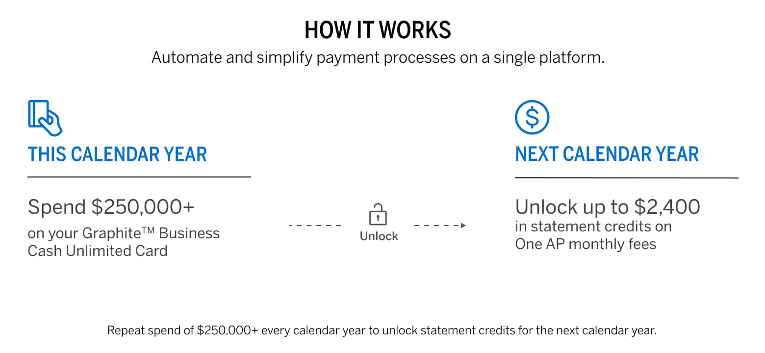 Unlock up to $2,400 in statement credits for use in the next calendar year on American Express One AP® monthly fees*** after you spend $250,000 on eligible purchases on the Graphite™ Business Cash Unlimited Card in this calendar year.**** Statement credits will be applied to your monthly bill charged to the Card for our accounts payable solution, One AP. Terms apply.7