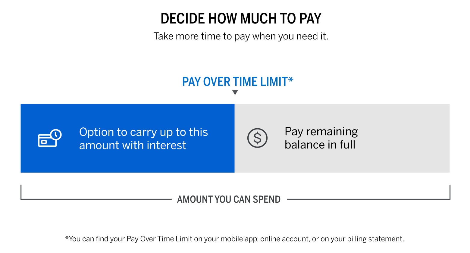Eligible Charges: Eligible charges made by you or any Additional Card Member on your account can be paid over time. The following types of charges are ineligible for Pay Over Time: American Express® Travelers Cheques and other cash equivalents, certain insurance premiums, casino and other gambling transactions, any fees owed to American Express except foreign transaction fees, and other transactions designated by us. In addition, statement credits for eligible purchases, or any reversals of a statement credit, may be applied to either your Pay Over Time balance or Pay In Full balance regardless of where the eligible purchases originally posted. Any charge subject to a foreign transaction fee is not eligible to be moved to Pay Over Time on your Closing Date. Pay Over Time Settings: Pay Over Time on your account is initially set to On. There are two settings, On and Off. When set to On, eligible charges will be automatically placed in your Pay Over Time balance, up to your Pay Over Time Limit. When set to Off, no new charges will be included in your Pay Over Time balance. You can change this setting by visiting your online account or calling the number on the back of your Card. Interest on your Pay Over Time balance: For charges added automatically to a Pay Over Time balance, at the time they post to your account, we charge interest beginning on the date of each charge. For charges that we automatically move from your Pay in Full balance to your Pay Over Time balance on your Closing Date, we charge interest from the day after they are added to your Pay Over Time balance. We will not charge interest on charges automatically added to your Pay Over Time balance if you pay your account Total New Balance by the Payment Due Date each month. If at the time you turn on Pay Over Time, you’re already carrying a Pay Over Time balance from your last billing period, we will charge interest on new eligible charges added to a Pay Over Time balance from the transaction date. However, for charges that we move from your Pay In Full balance to your Pay Over Time balance on your Closing Date, we will charge interest from the day after they are added to your Pay Over Time balance. You must pay in full, by the Payment Due Date, any charge or portion of a charge that is not added to a Pay Over Time balance. Pay Over Time Limit: We assign a Pay Over Time Limit to your Account. Your Pay Over Time Limit is the maximum amount you may carry as a balance. We may increase or decrease the amount of your Pay Over Time Limit and will tell you if we change that amount. Your Pay Over Time Limit may be different than the total amount you are allowed to spend on your Card. You must pay at least the Minimum Payment Due by the Payment Due Date each month to keep your account in good standing. The Minimum Payment Due includes all Pay in Full charges, any interest accrued on your account and a portion of your Pay Over Time balance. No Preset Spending Limit: No Preset Spending Limit means your spending limit is flexible. Unlike a traditional Card with a set limit, the amount you can spend adjusts based on factors such as your purchase, payment, and credit history.